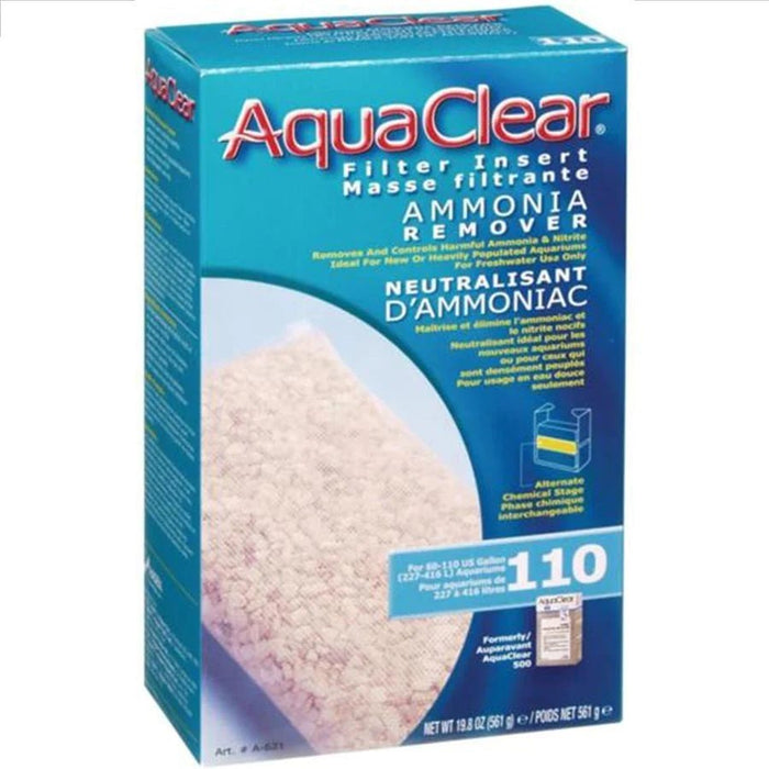 AquaClear 110 Ammonia Remover is ideal for new or heavily populated freshwater aquariums. It removes and controls harmful ammonia and nitrite, creating a healthy aquatic environment. Controlling ammonia levels is critical for reducing stress on fish. Exclusively designed for use in the AquaClear 110 Power Filter. Single pack. Net Weight: 550g